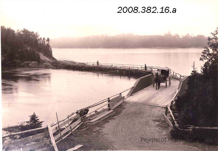 A B/W photograph of the bridge between Great and Orr's Island. There is a horse and wagon stopped on the bridge. Two women are walking along the road. Undated