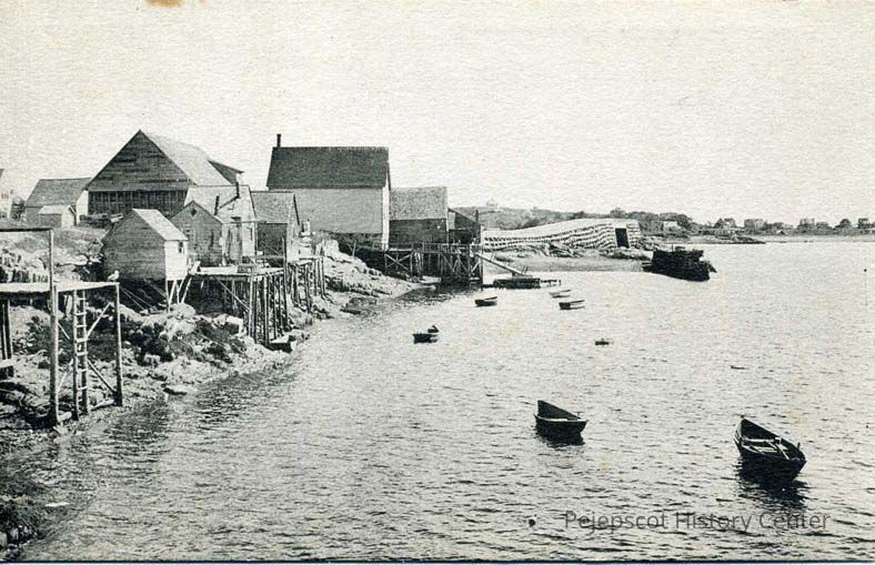 An undated black and white postcard showing a partial view of the east shore of Orr's Island looking south. The Cribstone Bridge connecting Orr's Island and Bailey Island is visible in the distance.