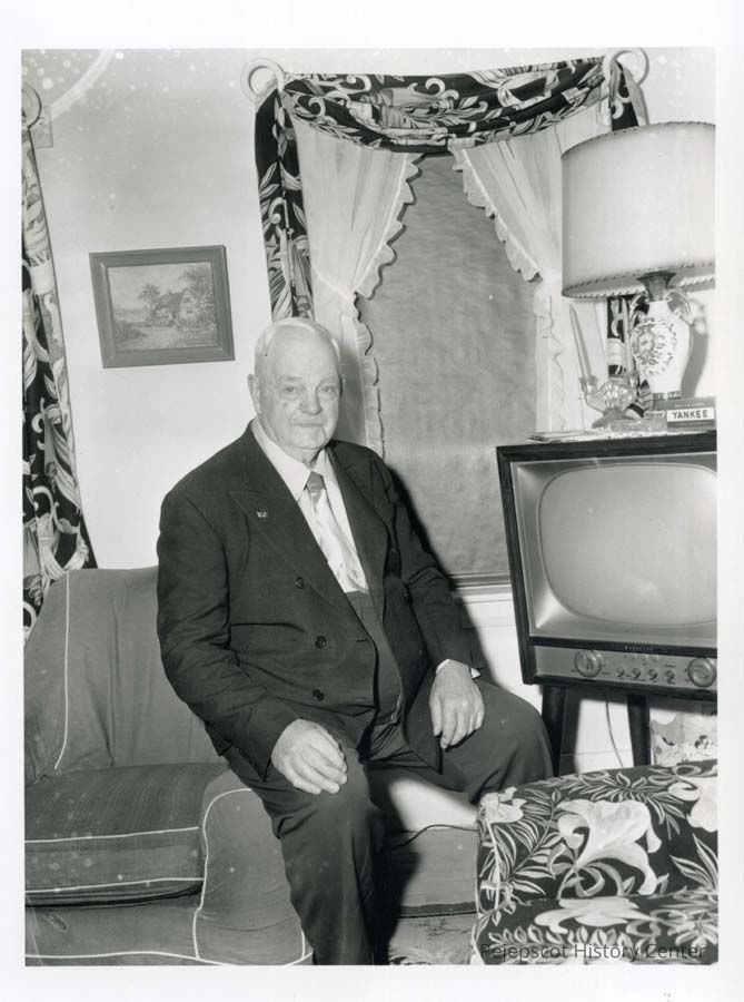 B/W photo of William E. Sylvester, Sr., Orr's Island, on his 83rd birthday, 3/12/1955. He is sitting on the arm of a chair and a TV is beside him.