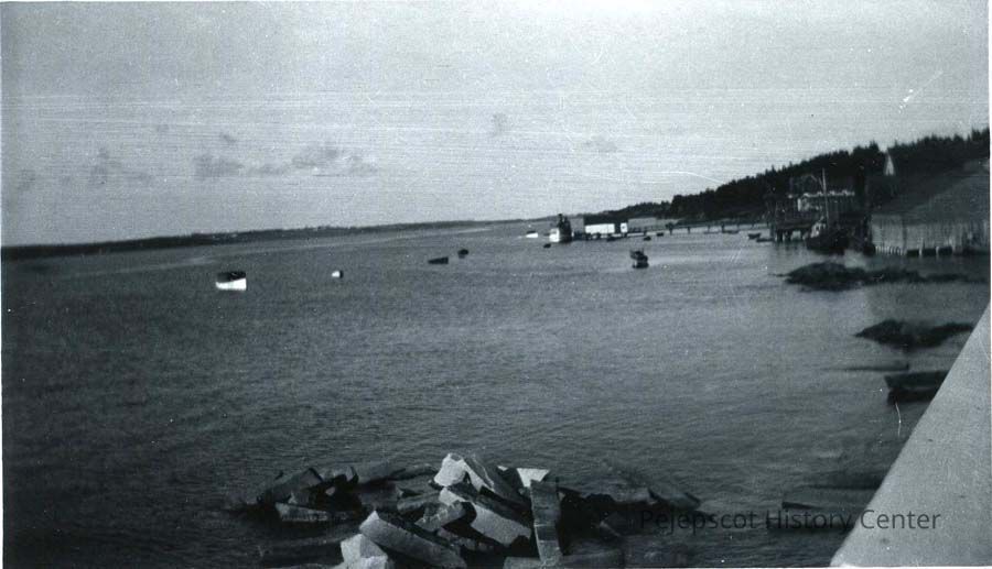 A black and white photo of the Orr's Island shoreline, with a steamboat docked at the steamboat wharf off in the distance. Photo was taken from the bridge at the south end of Orr's Island which connects to Bailey Island, dated October16, 1927. Harpswell, Maine