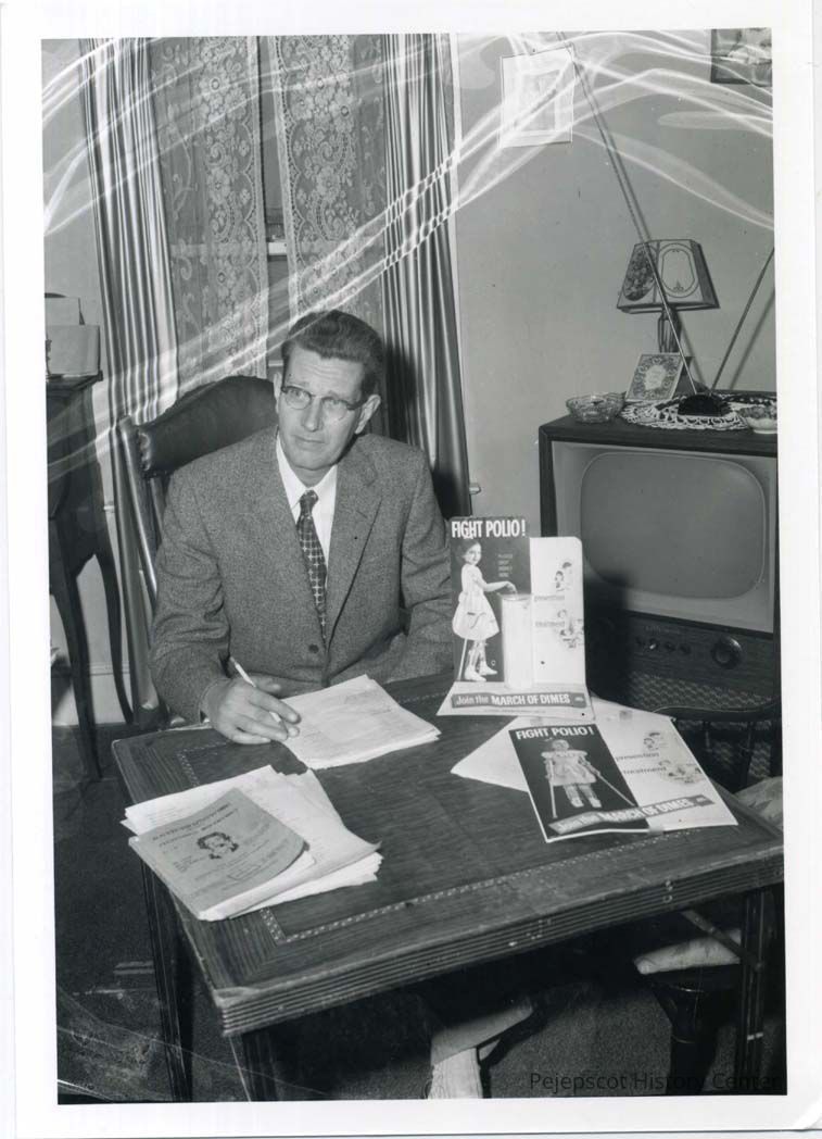 Oscar W. Brackett, Sr. poses for the camera next to "Fight Polio" posters after being named Polio Chairman on 1/20/55.