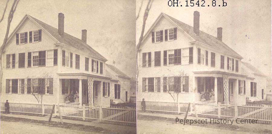 A B/W stereo view of the Otis House on Cumberland Street, Brunswick, ME which was once known as O'Brien Street. It shows two women standing and a child sitting on a porch and a man walking by on the sidewalk. Marked on the back, "[Furbish] Otis House [10] Cumberland St (c. 1876)" Undated
