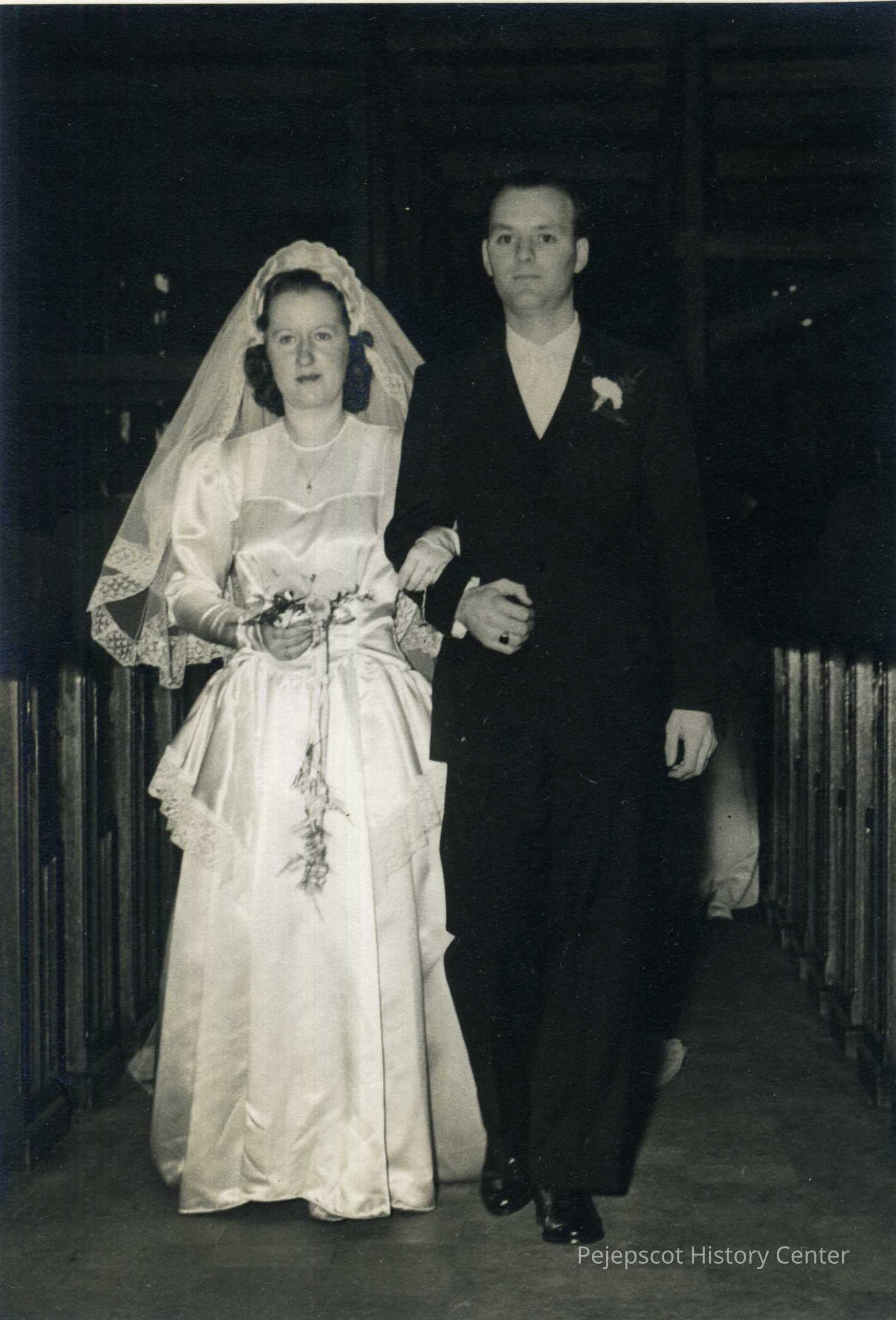 Emilia Jeannette Ouellette and J. Edouard Albert Poitras walking down the aisle after their St. John's Church wedding. 10/04/1947