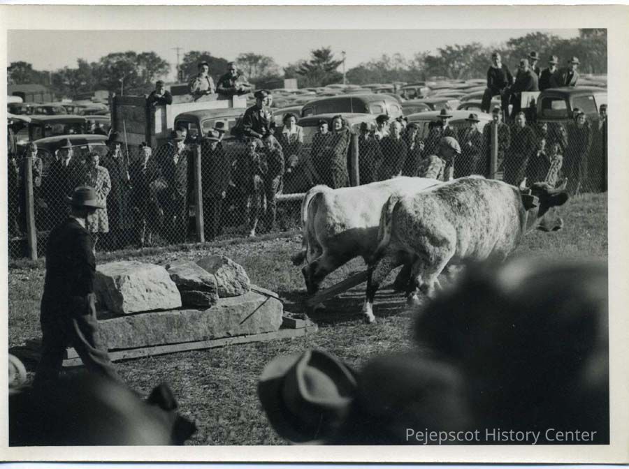 B/W photo of the Oxen Pull at the Topsham Fair in 1940.
