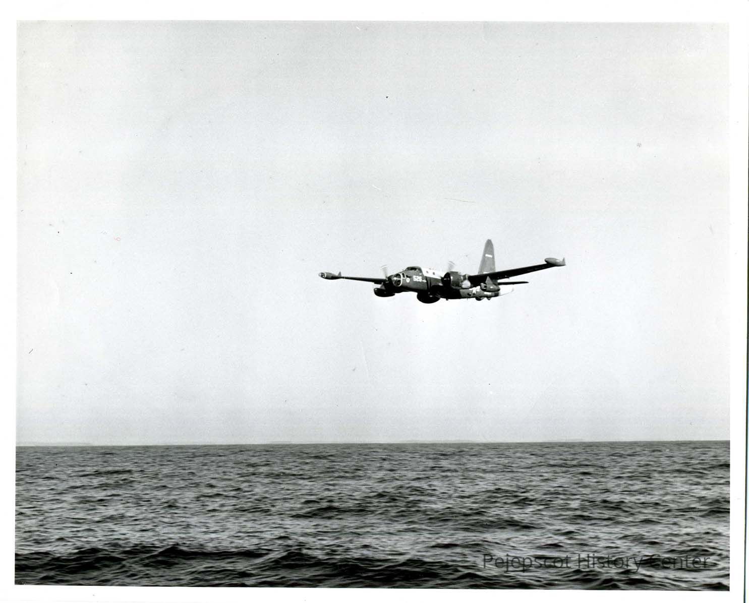 Black and white photo of a P2V-7 from Brunswick Naval Air Station flying over the ocean. Undated