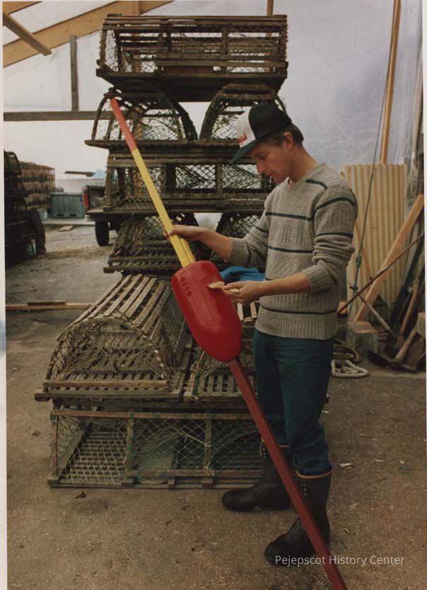 A color photograph of a man painting a lobster trap buoy in Harpswell, ME. He is stood in front of stacked lobster traps in his fishing boots sporting a cap. The buoy is getting a fresh coat of red paint applied.