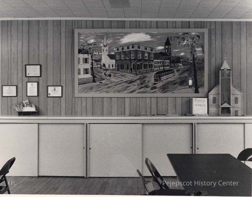 A B/W photograph of a painting in the United Methodist Church. The painting shows the intersection of Pleasant and Maine Streets. Undated