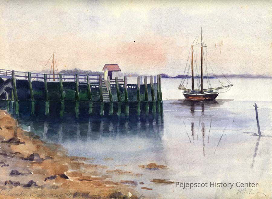 An original watercolor titled "The Sunken Schooner Wharf" signed H.L. Varney (Helen) L. Varney, an art teacher who taught the donor. The painting shows a pier bait house & sailboat, brown rocks in the left foreground, pier in gray and shadowed green piling, sailboat in shaded red, black & gray with sails down. Shows steps leading down to the water with land in background and sky and water, as well as the tip of another sailboat on the other side of the pier. On the reverse of the painting is written "Old Wharf, Harpswell Center". Undated.Lexicon