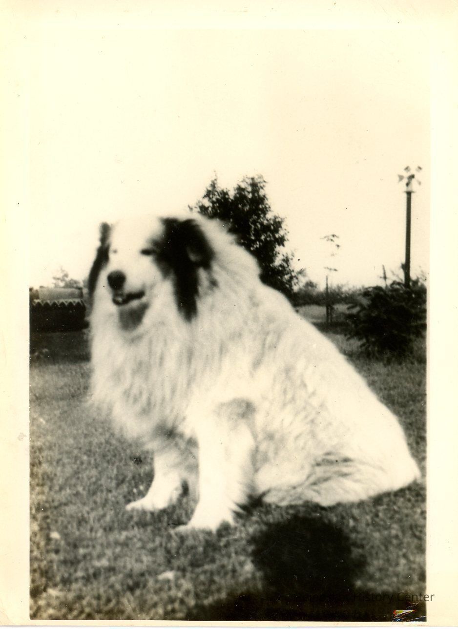 A 2.75" x 4" photo of a long-haired dog sitting in the grass. Back reads ""Pal" Cutler, Thelma' Cutler's family dog"