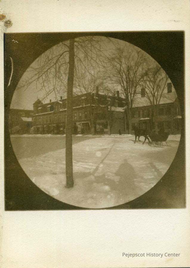 Copy of black and white photo, round format, of the Palmer Farm House, Tondreau Block and Dunlap Block in background on Maine Street during the winter. A horse & sleigh pass along the street. The Tondreau Block burned in 1925.Collection
