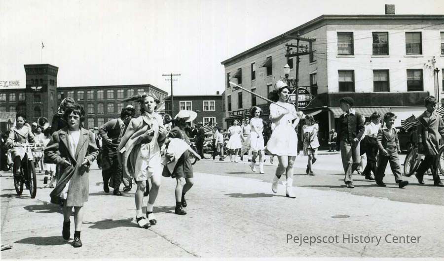 B/W photo of baton twirlers at the Memorial Day parade, May 30, 1946. Leader is Peggy Knight.