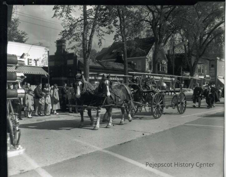 A parade with two horses pulling a hand tub passes in front of Riley Insurance Company on Maine Street.