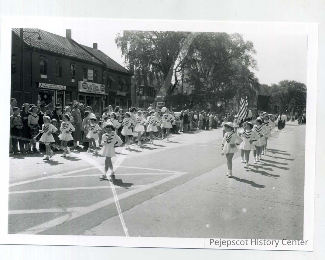 A group of majorettes walk down the street in an unknown parade on March 23, 1955.