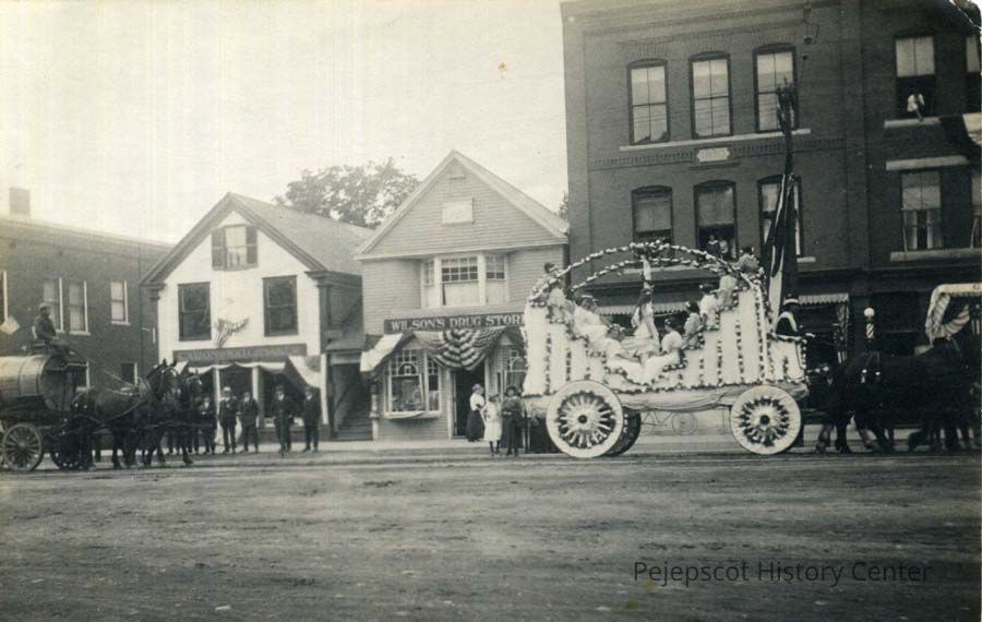 A B/W photograph of a float in the 1916 parade. They are in front of 84-82-80 Maine St. The tank on a wagon is part of the street sprinkling operation.1916