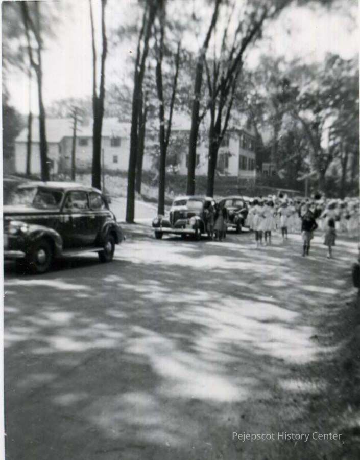 A B/W photograph of a Parade 1941. Drum Majorettes in front of the Elks Club on Park Rowe.