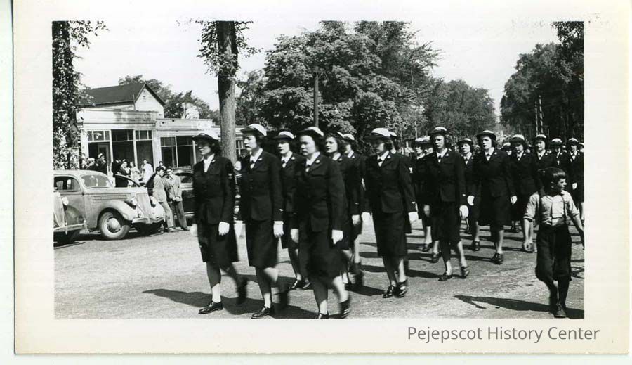 B/W photo of female Navy personnel (WAVES?) in a parade on Maine Street in the 1940s.