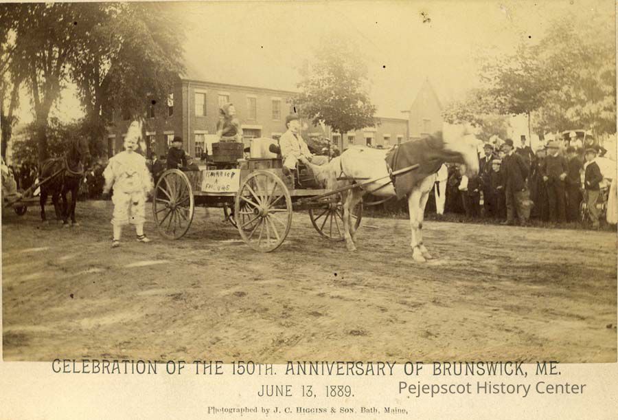 A sepia-toned photo of a portion of the 150th Brunswick Anniversary parade. This float has a sign on it that appears to read: "Is Marriage a Failure." A woman dressed as a washerwoman rides the wagon, and she and the driver appear to be wearing masks. Standing next to the wagon is a man dressed in a strange white costume. Behind them is the same building that appeared in other photos of this parade. Dated 06/13/1889.