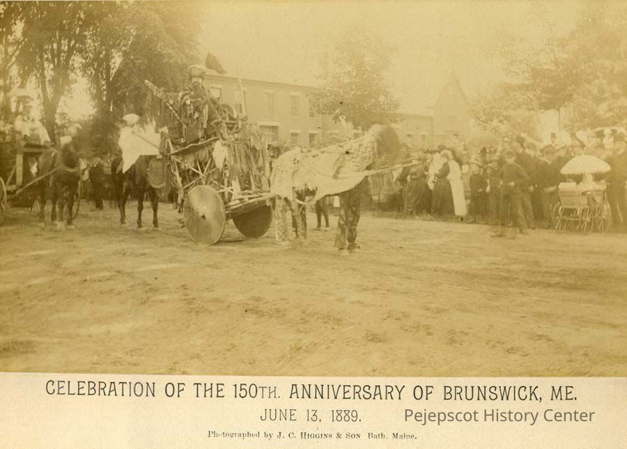A sepia toned photograph of a wagon pulled in the Brunswick 150th Anniversary parade. The wagon and horse appear to be covered with all sorts of rags, and perched high on the wagon is a bearded man. The wagon travels down an unidentified street with the same building as seen in 1973.6.14,1973.6.15 & 1973.6.20. Dated 06/13/1889.