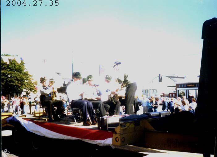 A color photograph of Brunswick's 250th Anniversary Parade (Oct 1989) showing a float with a small band on it. The band is made up of older men.