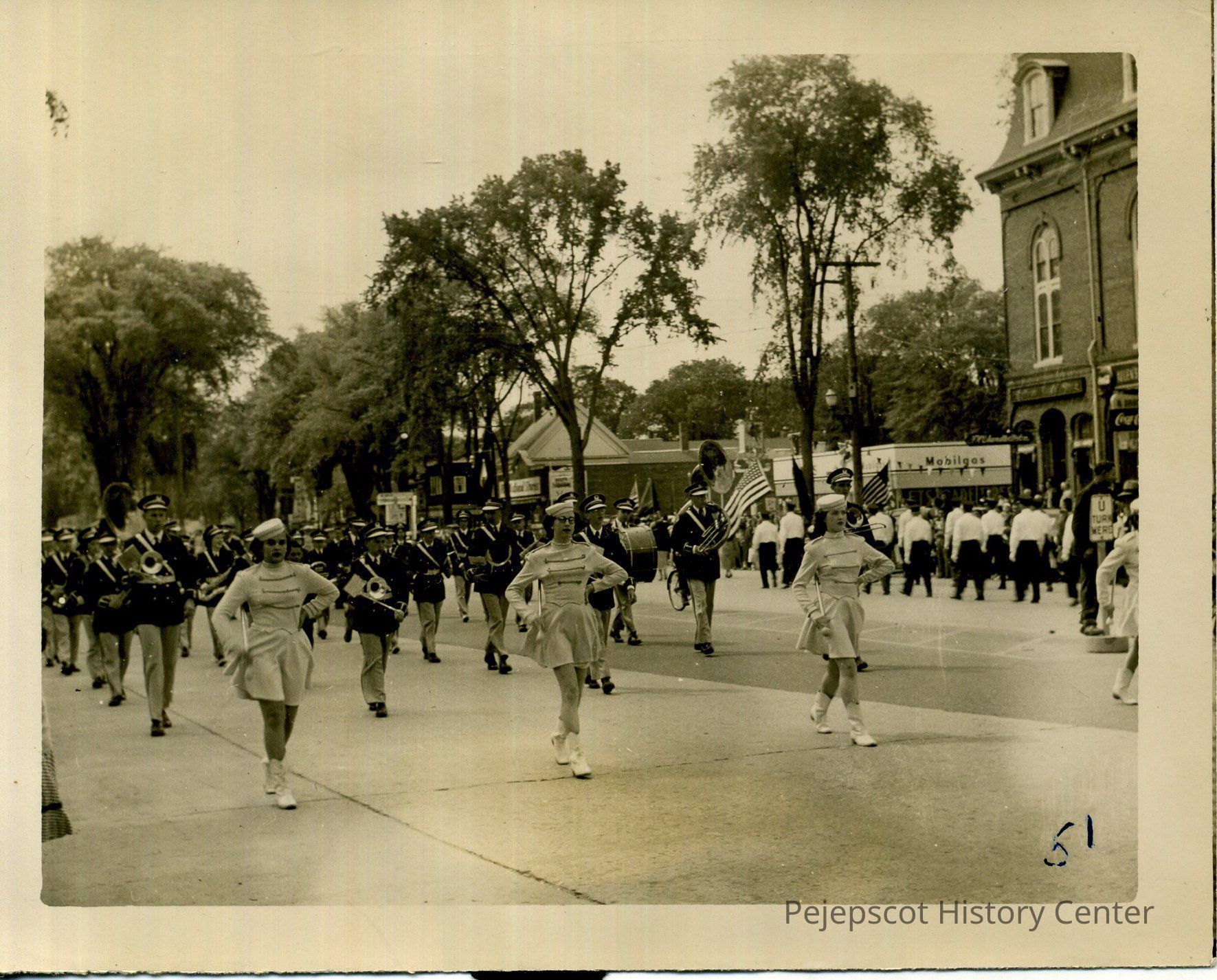 Black and white photograph of a parade down Maine Street featuring a marching band and four baton twirlers. Undated