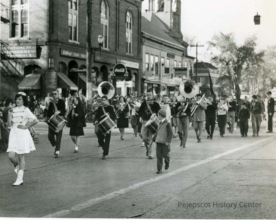 A B/W photograph of a parade at the corner of Pleasant and Maine Street. The College Book Store, Allen's Drug Store and the Craft Shop can be seen. Undated