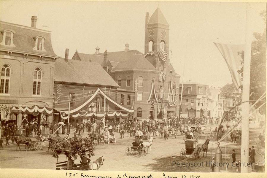 Streets - Maine, Streets - Maine Street, Maine Street, Brunswick, Maine Street, Celebrations, 150th Anniversary - Brunswick, Celebrations - Brunswick, Sesquicentennials, Sesquicentennial, Parade, Parades - Brunswick, Town Hall - Brunswick, Knights of Pythias Building, Parades - 150th Anniversary