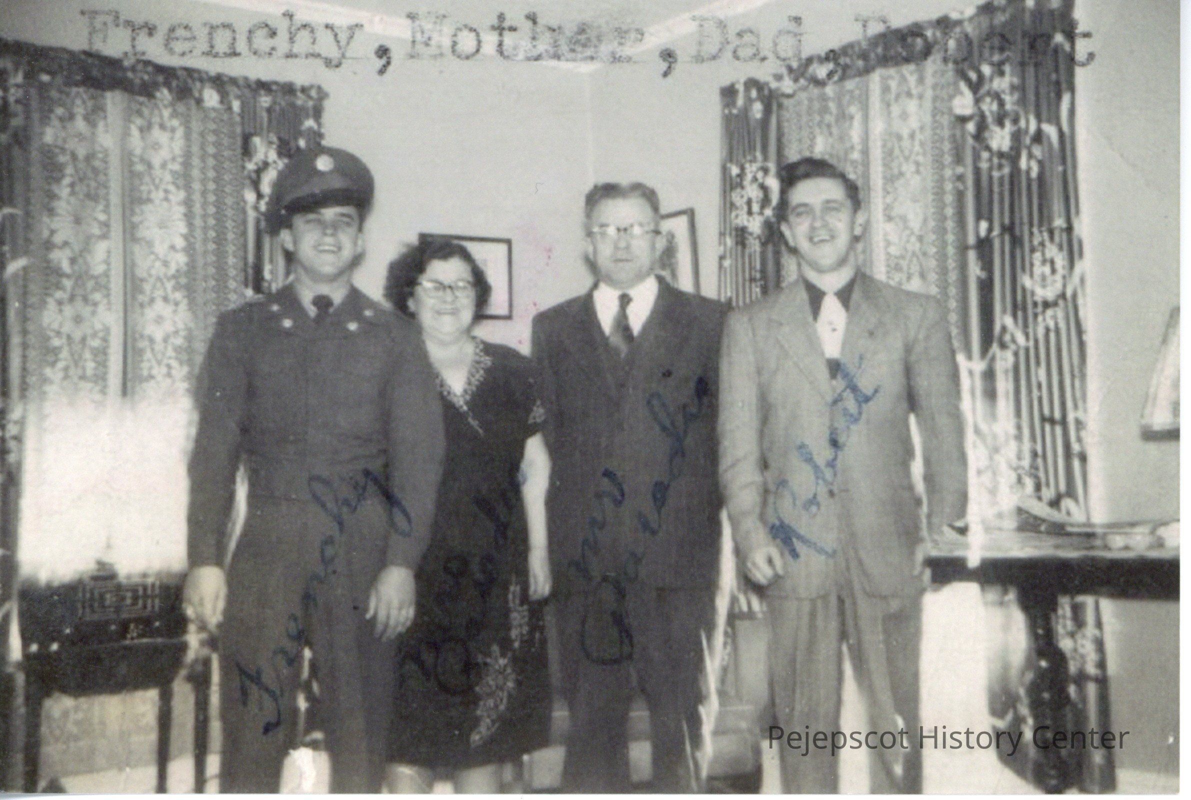 Black and White photograph of Paradis family, with floral window curtains in background. Left to right: Maurice (Frenchy) Paradis, Agatha Racine Paradis, Edward Paradis, Robert Paradis. Maurice is dressed in military uniform.Collection
