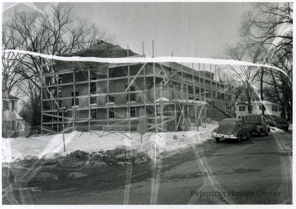 This photo shows the parish house of the First Congregational Church under construction at the corner of Cleveland and Maine Streets. The building will provide offices, classrooms, and meeting space for the church organizations.