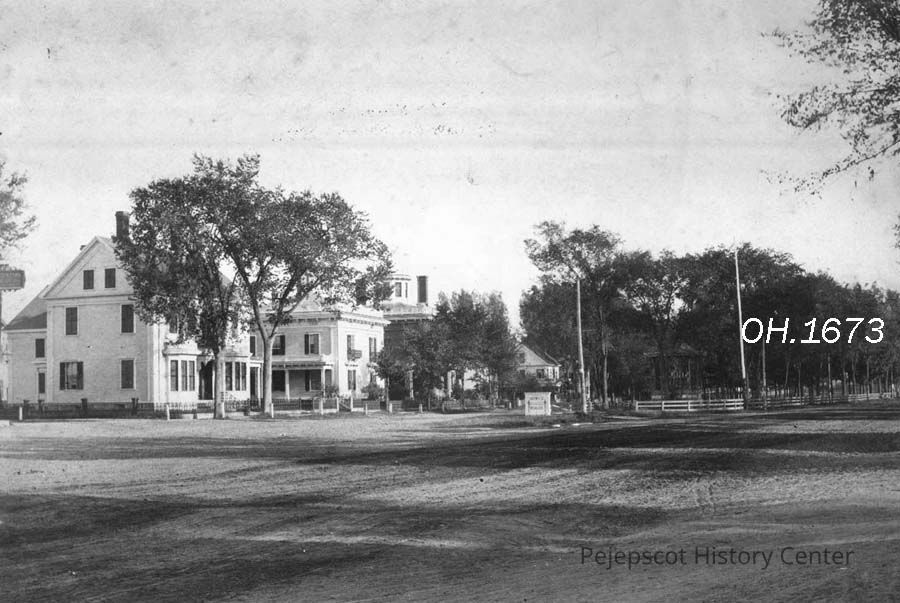 A B/W photographic view of the Mall looking south from the north end, Brunswick ME. The Skolfield houses on Park Row can be seen. Historic residence of the Hon. Benjamin Orr at 153 Park Row, Brunswick. The house was built about 1819. In 1846, it was the "Brunswick Seminary" and in the early 19th century it was a primary school kept by Mr. Pike, and residence of Rev. Adams, Congregational minister. Isaac L. Skolfield, son of George and Lydia Doyle Skolfield, acquired the residence in 1871 and his son, George Lincoln Skolfield acquired the house in 1910. George Skolfield built 155-157 Park Row in 1854. Isaac's brothers, Alfred and Samuel built the double residence at 159-161 Park Row in 1858-1862. Photo dated ca. 1890.Collection
