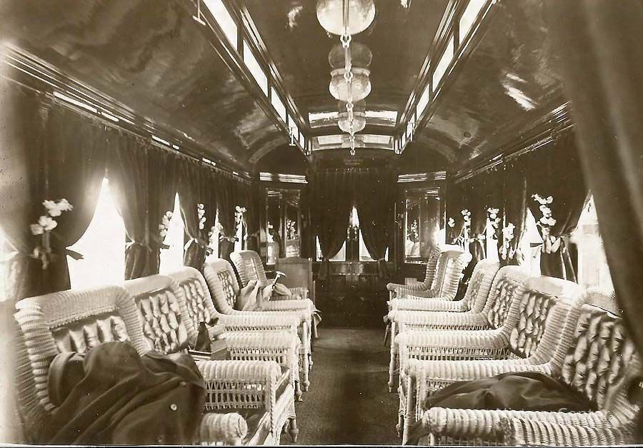 A B/W photograph of the interior of the parlor car "Merrymeeting." Undated