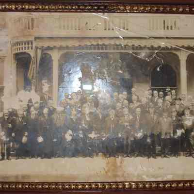 A framed black and white photograph of the participants, fourth and final general conference at Gettysburg, May 16 and 17, 1913. They include General J.L. Chamberlain and Dr. Abner O. Shaw (Chamberlain's doctor). 05/17/1913