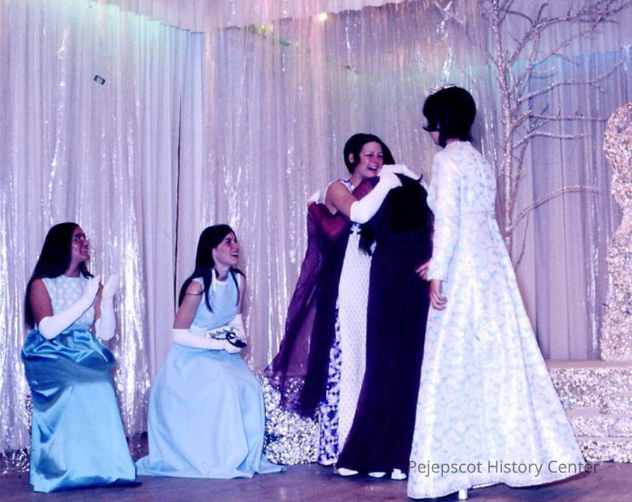 A 35 mm color slide of a participants in the 1973 Miss Teen Queen Pageant. Doris Bernier, a former Teen Queen is back to the camera. Seated on the left is Diane Racine and Susan DiEdwardo. It appears that Althea Kinney has just been announced as the 1973 Pageant winner. The slide is marked, "13" and in red ink,"2-68". Undated