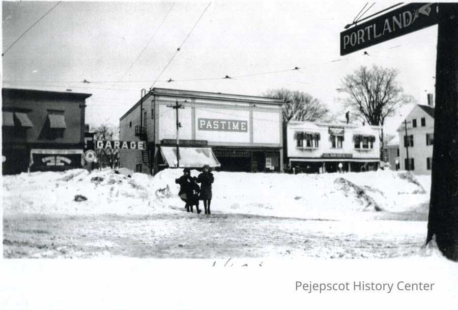 A color photocopy of a B/W photograph of the Pastime theatre, Maine Street Brunswick.