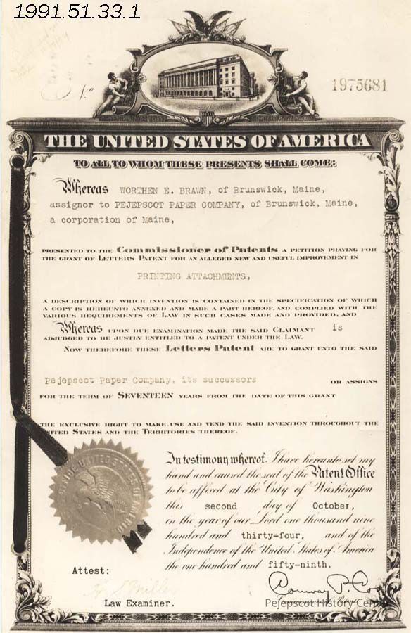 An undated black and white photograph of a certificate granting a patent for printing attachments. The certificate also acknowledges the assignment of the patent from Worthen R. Braun of Brunswick, Maine to the Pejepscot Paper Company of Brunswick, Maine. The patent, which is good for 17 years, is dated October 2, 1934. The number on the certificate is 1975681.Collection