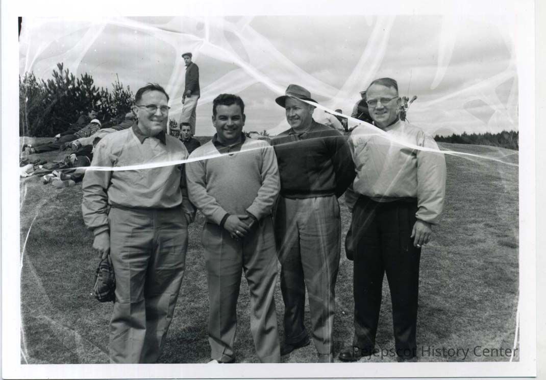 Four men face the camera at a Patriot's Day Golf Tourney on 4/16/55.