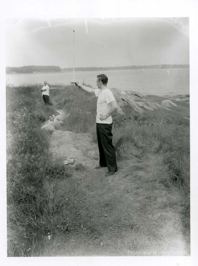 B/W photo of Patrolman James A. Bleau firing a gun at a police outing (8/9/1953). Another man is standing off to the side. Ocean is in the background.
