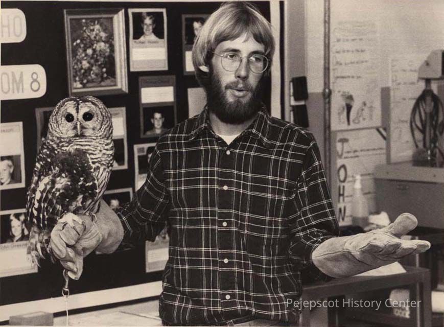 A black and white photo of Paul Arthur of the Chewonki Foundation showing an owl at Coffin School was published in The Times Record in Brunswick, Maine, on 10/21/1987.