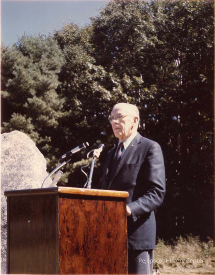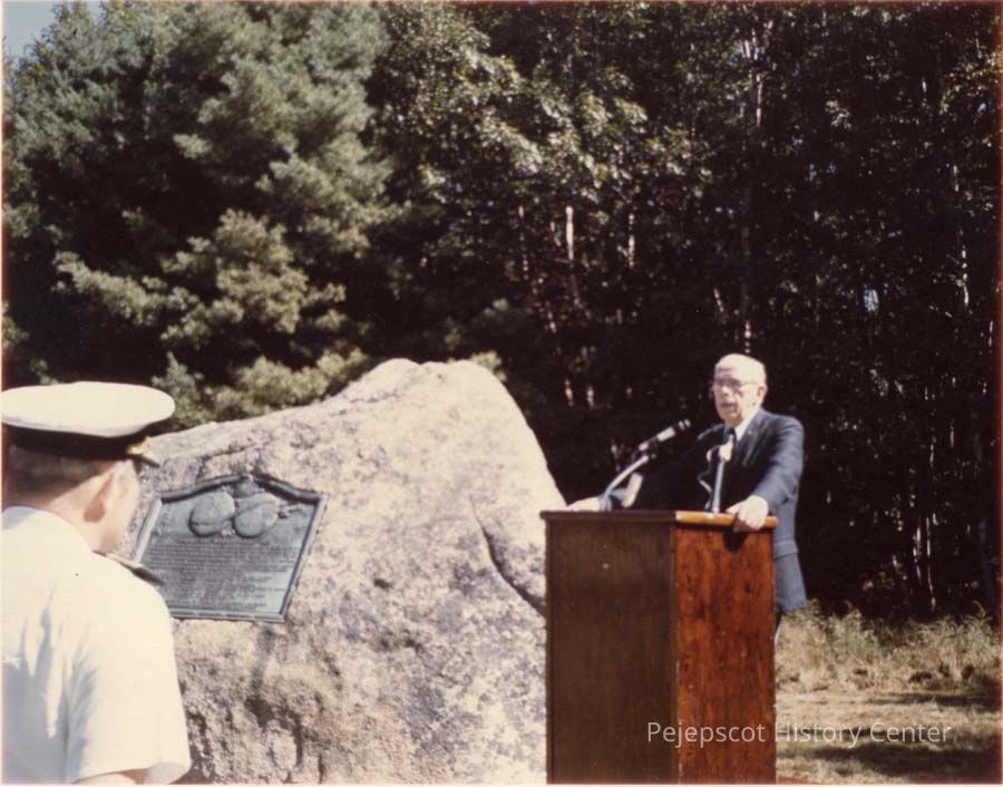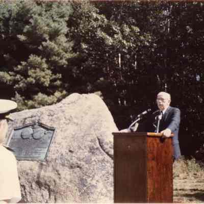 Photo of Paul Burbank, Master of Ceremonies, speaking at the commemoration of the 50th anniversary of the "Around the World Flyers" at Monument Rock, Mere Point ,Brunswick, Maine, 1974.Lexicon