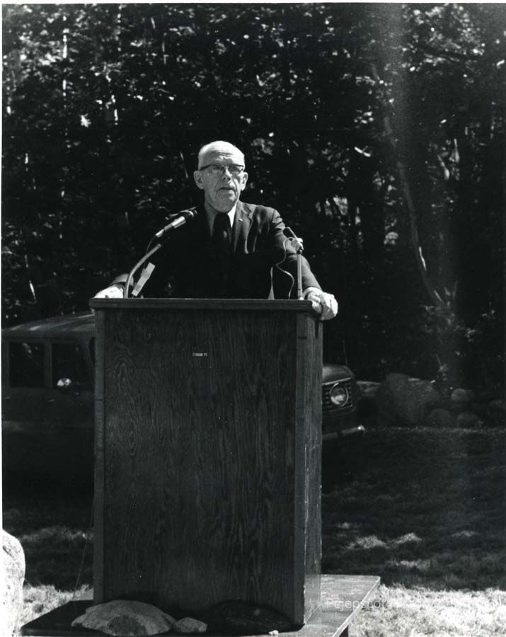 Paul Burbank, Master of Ceremonies, speaking at the commemoration of the 50th anniversary of the "Around the World Flyers" at Monument Rock, Mere Point ,Brunswick, Maine, 1974.Lexicon