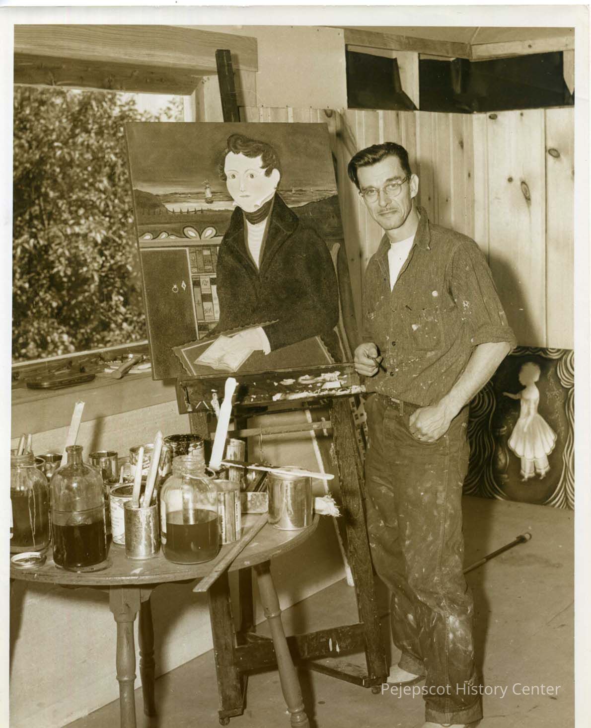 Artist Paul Gruenwald in his working clothes posed beside his painting. Slightly in front of him is a table loaded with paints. September, 1950.