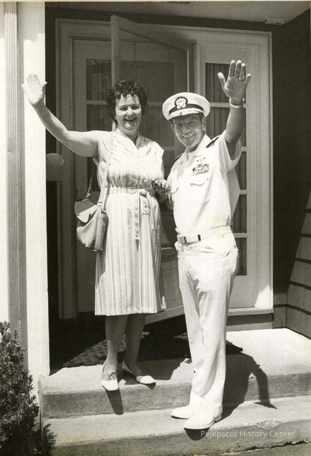 A B/W photographic view of Mary Fran Mulloy and Rear Adm. Paul J. Mulloy waving from the doorway of their new quarters at Brunswick Naval Air Station was published in The Times Record in Brunswick, Maine, on 5/11/1979.