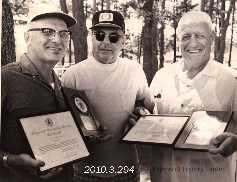 A B/W photograph of retiring Policeman Paul Viney (left), and Sgt. Chester Soucie (right) are presented with plaques by Police Chief Clement G. Favereau. Photo was published 8/10/1970. Undated