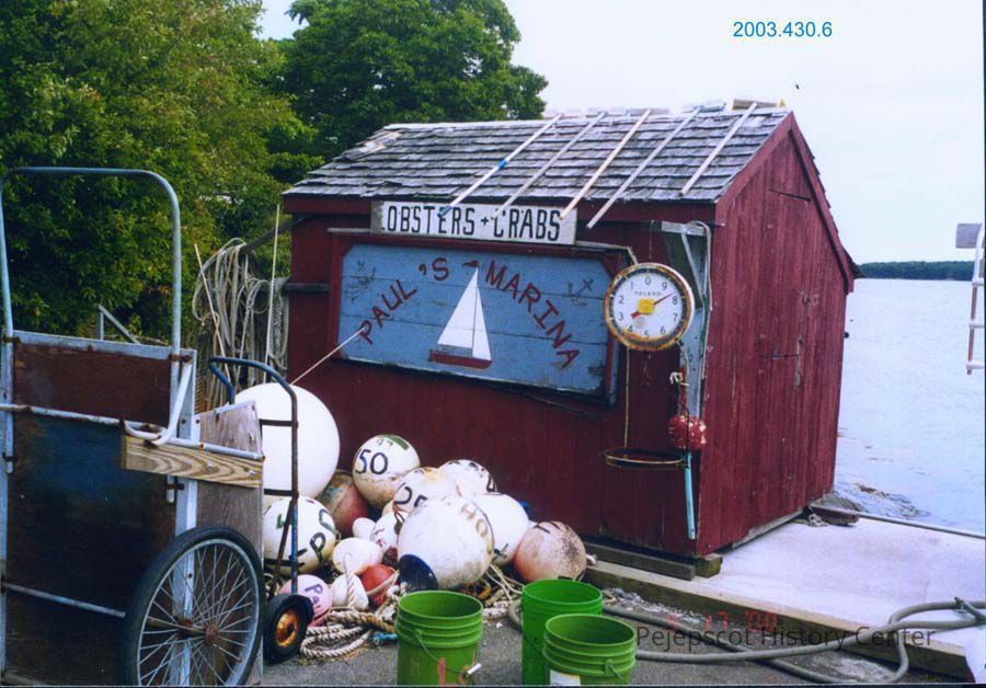 A color photograph of Paul's Marina on Mere Point Road, Brunswick, Maine, was taken about 2000. A small red building is near the water. It has signs that read "Paul's Marina" and "Lobsters & Crabs."