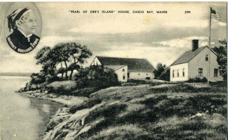 A B/W photographic view of the Pearl of Orr's Island House. There is a picture of Harriet Beecher Stowe in an oval inset.