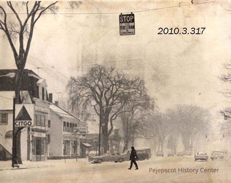 A B/W photograph of a pedestrian crossing Maine Street on a snowy morning. Photo was published 1/9/1974. Undated