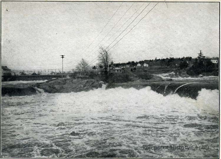 An undated black and white postcard shows the Pejepscot Falls on the Androscoggin River in Brunswick.