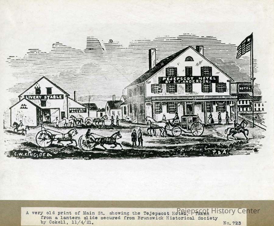 A very old print of Main Street in Brunswick. To the right is the Pejepscot Hotel with the words "Pejepscot Hotel by E.F. Anderson" on it. To the left is the Bowling Alley with the Livery Stable to the far left. A flagpole with an American flag with only one star is to the right of the hotel. People walking, on horses, and in horse drawn carriages line the street in front of the buildings. The picture is taken from a lantern slide secured from the Brunswick Historical Society by Cokel in 1921. Undated