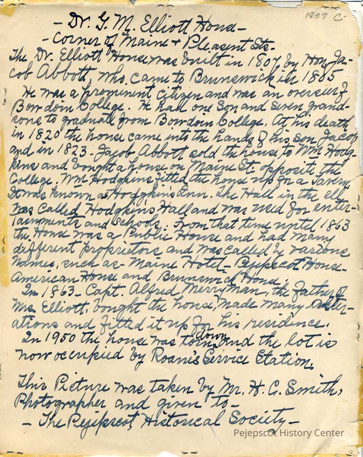 A B/W photograph of the Pejepscot House on the corner of Maine and Pleasant Street, Brunswick, ME. There is a complete history of the building written on the back of the photo. Not dated.