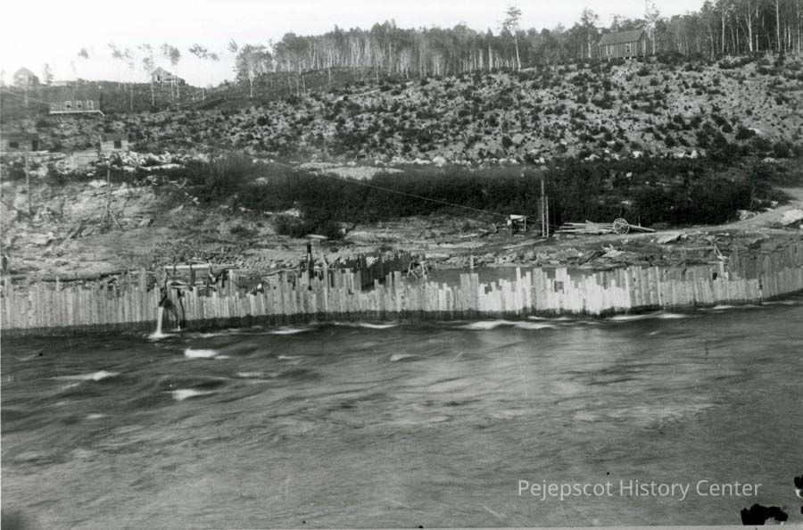 A B/W photograph of the beginning of construction of the Pejepscot Mill, Topsham, Maine. It shows the land clearing and pile driving.