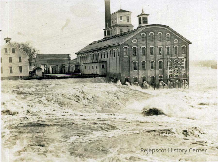 A B/W photo of the Pejepscot Paper Co. (Bowdoin Mill), Topsham, ME, during a flood on the Androscoggin River. Photo dated 1936.